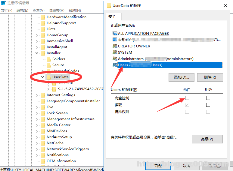 找到UserData后右键点击权限,然后将users用户设置为完全控制,勾选上,然后点击应用确定。再尝试重新安装软件,若安装过程中还是报error1402的错误就继续升级处理。直接在权限编辑器中添加一个everyone的账户并将其设置为完全控制,这样就可以彻底解决error1402的问题了。