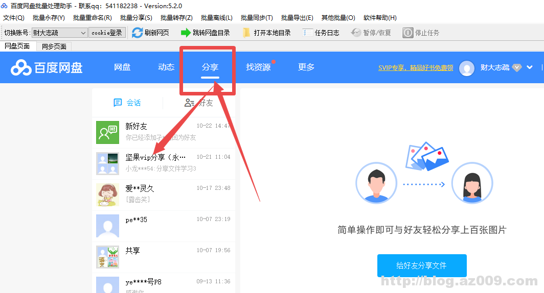 然后切换到分享视图,点击需要导出目录表的群组,进入文件库中勾选需要导出目录表的文件夹。勾选后点击批量导出菜单下的导出群组文件表,ok。软件会开始运行并在左下角有提示信息。