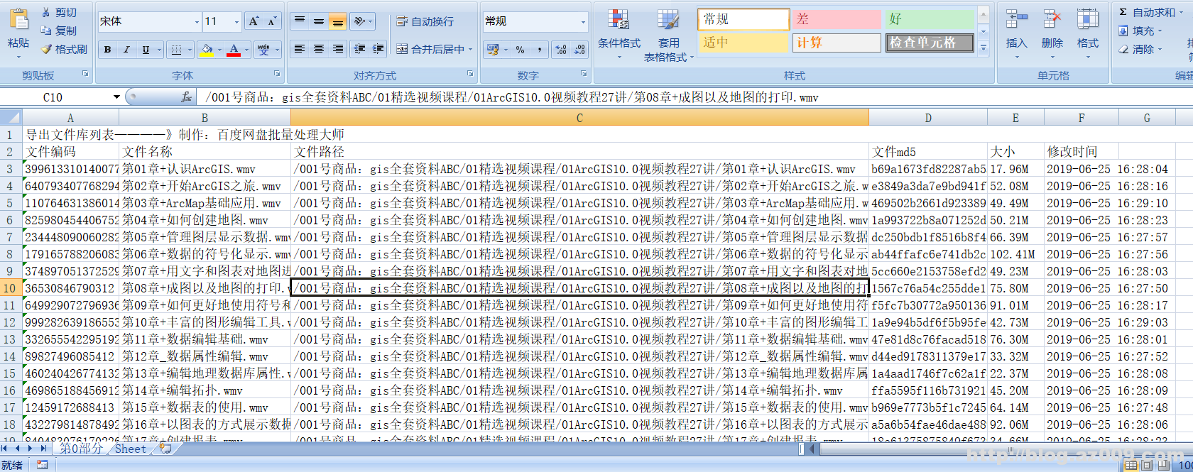 点击开始后软件会逐步遍历选择的文件夹下所有文件信息,并最后导出目录表格,表格存放在我的文档下bdmaster文件夹里面,可以直接点击软件正中间的‘打开本地目录’按钮查看到。目录表格中字段有:文件名称、完整路径、时间、大小等等信息,具体样式如下: