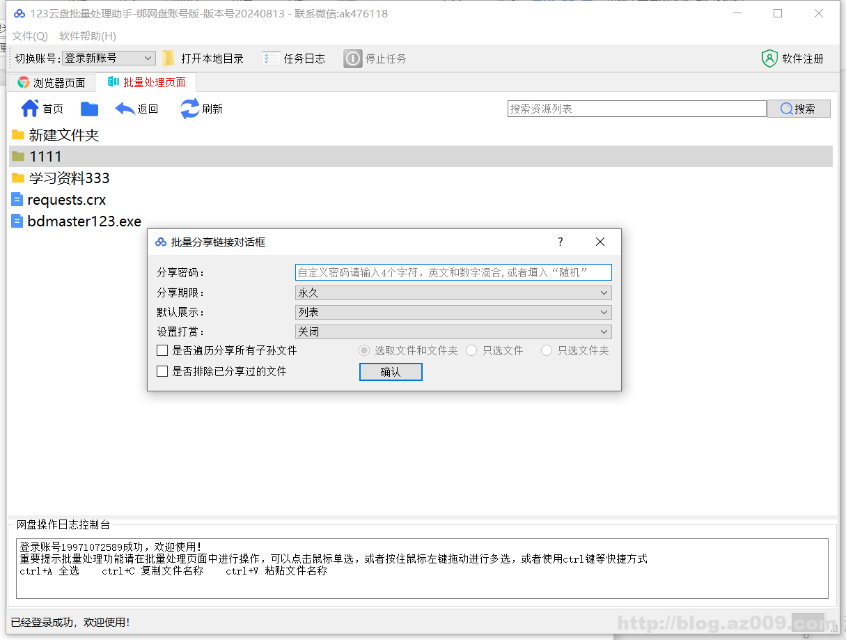 在批量处理页面,选中文件或文件夹,然后右键会弹出包含批量分享的菜单,选中批量分享,根据需要设置批量分享对话框,如是否有密码,密码自定义,分享时间自定义,是否设置打赏,是否只分享文件或文件夹,是否需要排除已经分享过的文件等。设置好后点击确认即可,软件会先遍历获取到整个文件夹中所有的文件,然后逐步分享文件,在分享过程中软件会在控制台显示日志提示信息。结束后会导出一张分享的链接表格。