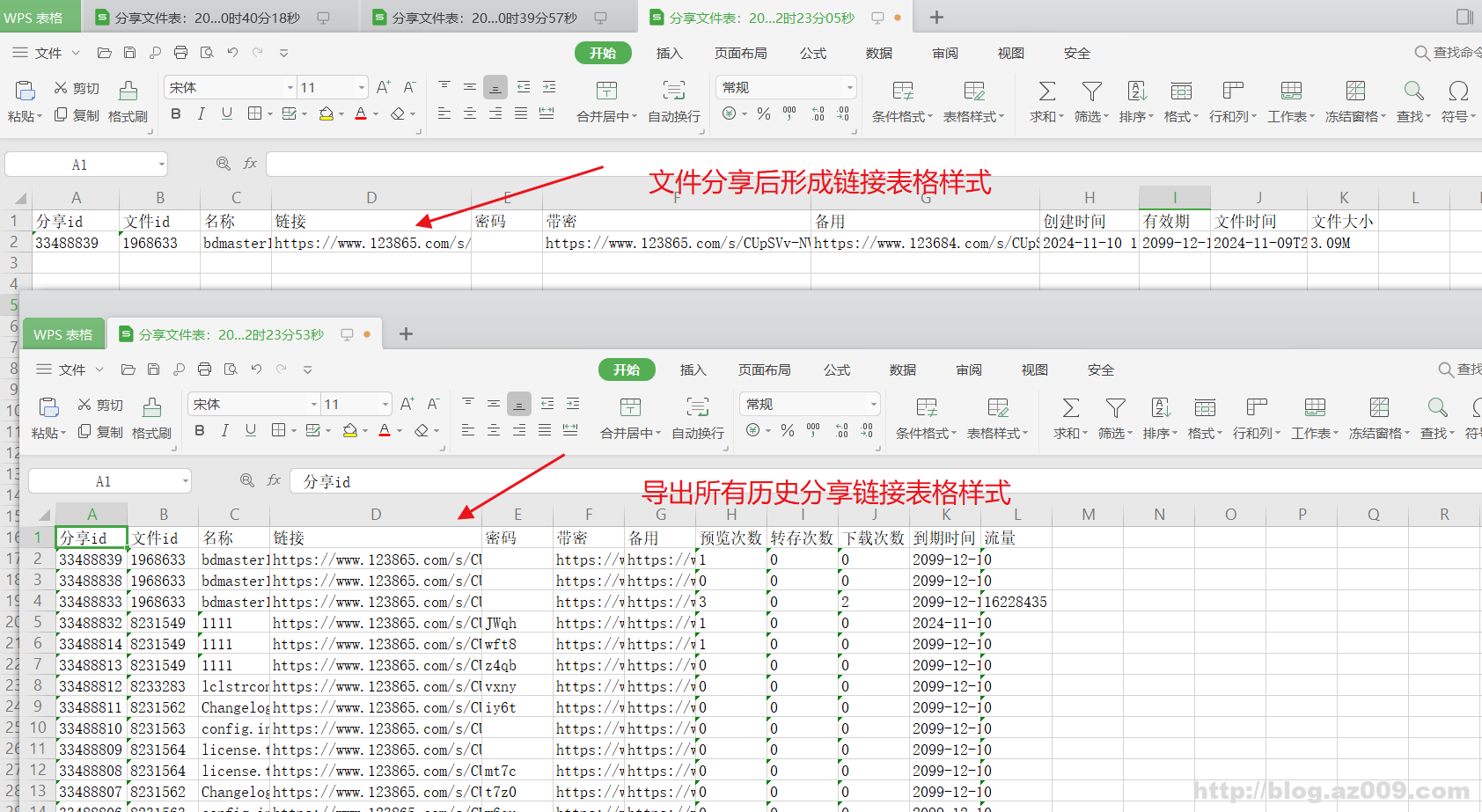 结束分享后点击软件界面正中间的打开本地目录按钮,会看到分享出来的表格,表格样式如下。另外,右键也可以选择导出历史所有分享链接的表格,里面包含了链接、密码、浏览次数、下载次数等信息。